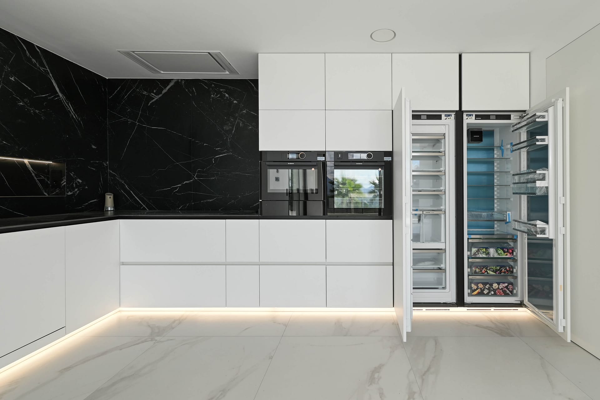 The main living level is a masterclass in contemporary design, featuring an expansive open-plan living and dining area, complemented by a state-of-the-art kitchen equipped with high-end appliances. Floor-to-ceiling glass sliding doors flood the space with natural light, creating a harmonious blend between the interior and the spectacular coastline beyond.