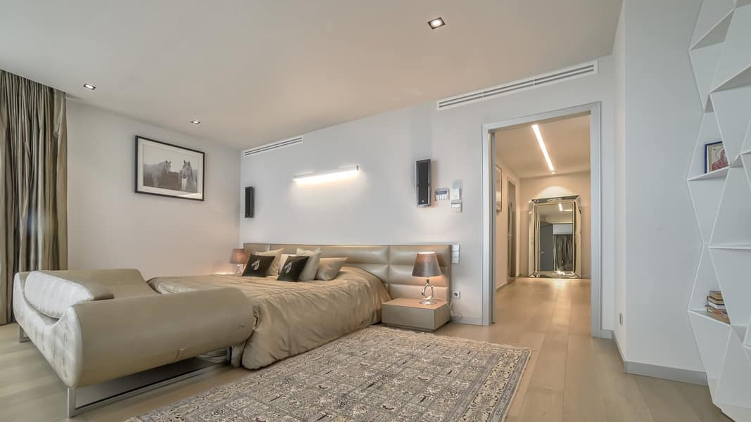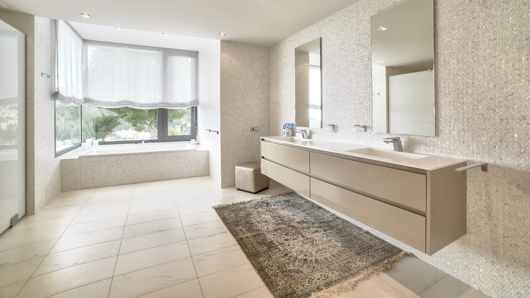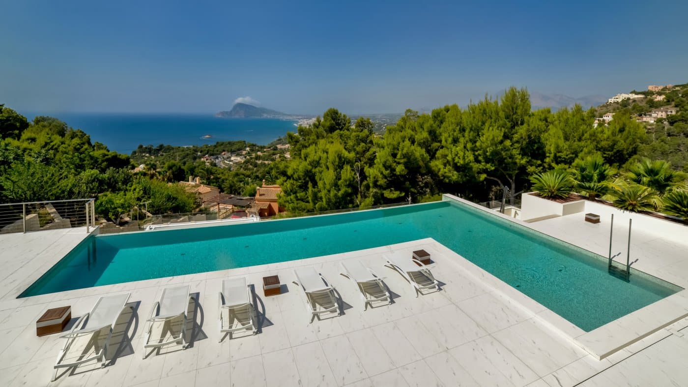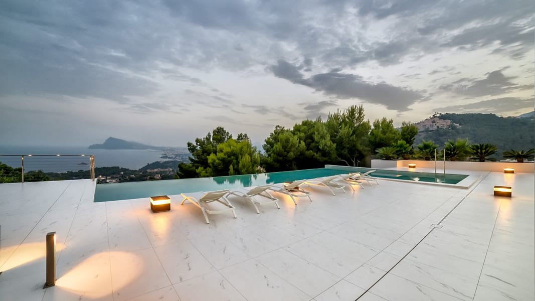 Spectacular luxury villa for sale in Altea Hills. This stunning villa enjoys spectacular panoramic views of the sea and sun all day (South orientation). It is located in a private urbanization with restricted access (very quiet area), 3,5 Km from the sea (Marina Greenwich Yacht Club), near the urban centre of Altea. It is located on three building plots of total 3.080 m2 and has a total constructed area of 1.800 m2 distributed over several floors (with elevator), as follows: on the main floor we have 1 guest toilet, a dressing room of 15 m2, very large open plan living room kitchen of 200 m2 (with fireplace) which gives access to the fabulous outdoor terrace of 250 m2 where we have an incredible pool of 120 m2 with self cleaning and salt system and a tennis court. On the ground floor we have 3 independent areas, the first area has a large dining room kitchen of 60 m2, indoor pool of 36 m2, jacuzzi, gym of 25 m2, beauty salon with hairdresser included of 20 m2, finnish sauna for 6 people, turkish sauna for 6 people, double shower, 1 guest toilet and a wine cellar. The second area is an apartment for the service that consists of an open plan living room kitchen, 1 bedroom, 1 bathroom and a laundry room. The third area would be the guest area that has 3 large bedrooms (25 m2 + 25 m2 + 35 m2), 3 en suite bathrooms, 70 m2 game room, 40 m2 movie theatre (completely soundproofed), 30 m2 office, 50 m2 facilities room and 1 guest toilet. In the basement we have the garage of 75 m2 for 3 vehicles. On the upper floor we have 3 large bedrooms (30 m2 + 25 m2 + 30 m2), 3 large bathrooms en suite (25 m2 + 12 m2 +12 m2), 1 dressing room of 10 m2 and 2 private terraces (10 m2 + 15 m2). This luxury villa has been built in 2016 and is in perfect condition. It is equipped with all the luxuries you can imagine, fendi furniture included, high quality carpentry, ducted air conditioning, underfloor heating, elevator, alarm with security cameras, high end tiles, fully equipped designer kitchen (Gaggenau), Fully equipped designer bathrooms, solar panels, LED lighting, etc. The garden is very beautiful and surrounds the house with fruit trees and tropical trees, in addition, it is low maintenance (automatic irrigation). It also has large outdoor spaces for many vehicles. Without doubt one of the most luxurious villas on the Costa Blanca.
