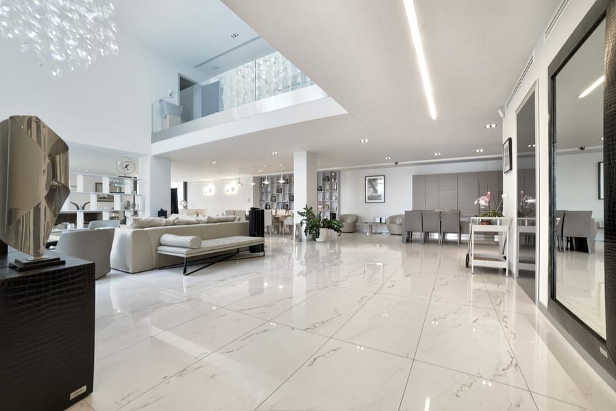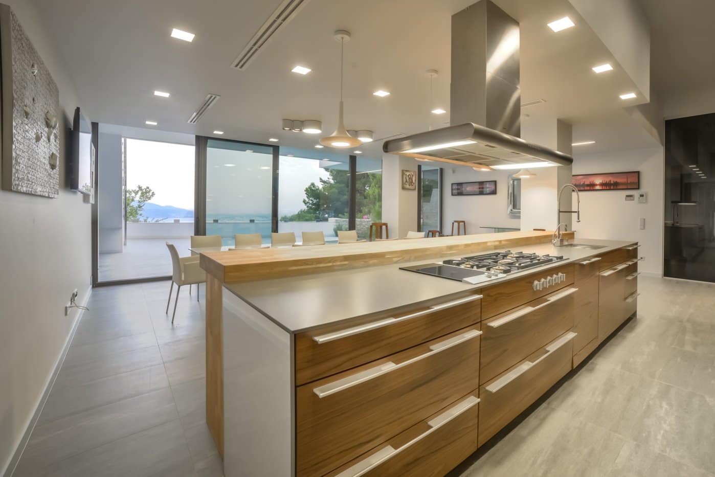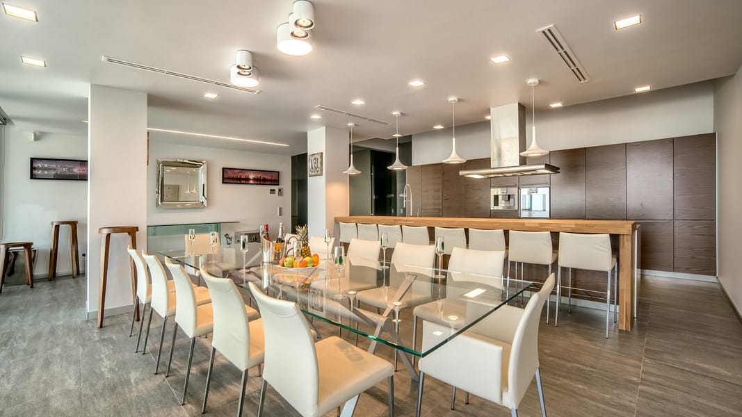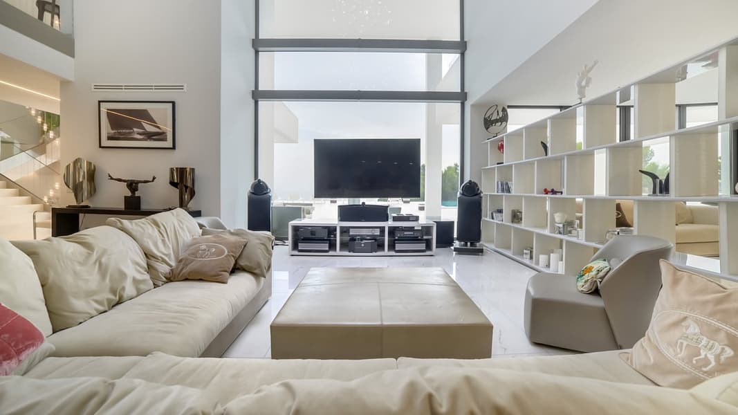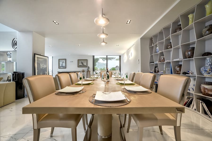 Spectacular luxury villa for sale in Altea Hills. This stunning villa enjoys spectacular panoramic views of the sea and sun all day (South orientation). It is located in a private urbanization with restricted access (very quiet area), 3,5 Km from the sea (Marina Greenwich Yacht Club), near the urban centre of Altea. It is located on three building plots of total 3.080 m2 and has a total constructed area of 1.800 m2 distributed over several floors (with elevator), as follows: on the main floor we have 1 guest toilet, a dressing room of 15 m2, very large open plan living room kitchen of 200 m2 (with fireplace) which gives access to the fabulous outdoor terrace of 250 m2 where we have an incredible pool of 120 m2 with self cleaning and salt system and a tennis court. On the ground floor we have 3 independent areas, the first area has a large dining room kitchen of 60 m2, indoor pool of 36 m2, jacuzzi, gym of 25 m2, beauty salon with hairdresser included of 20 m2, finnish sauna for 6 people, turkish sauna for 6 people, double shower, 1 guest toilet and a wine cellar. The second area is an apartment for the service that consists of an open plan living room kitchen, 1 bedroom, 1 bathroom and a laundry room. The third area would be the guest area that has 3 large bedrooms (25 m2 + 25 m2 + 35 m2), 3 en suite bathrooms, 70 m2 game room, 40 m2 movie theatre (completely soundproofed), 30 m2 office, 50 m2 facilities room and 1 guest toilet. In the basement we have the garage of 75 m2 for 3 vehicles. On the upper floor we have 3 large bedrooms (30 m2 + 25 m2 + 30 m2), 3 large bathrooms en suite (25 m2 + 12 m2 +12 m2), 1 dressing room of 10 m2 and 2 private terraces (10 m2 + 15 m2). This luxury villa has been built in 2016 and is in perfect condition. It is equipped with all the luxuries you can imagine, fendi furniture included, high quality carpentry, ducted air conditioning, underfloor heating, elevator, alarm with security cameras, high end tiles, fully equipped designer kitchen (Gaggenau), Fully equipped designer bathrooms, solar panels, LED lighting, etc. The garden is very beautiful and surrounds the house with fruit trees and tropical trees, in addition, it is low maintenance (automatic irrigation). It also has large outdoor spaces for many vehicles. Without doubt one of the most luxurious villas on the Costa Blanca.