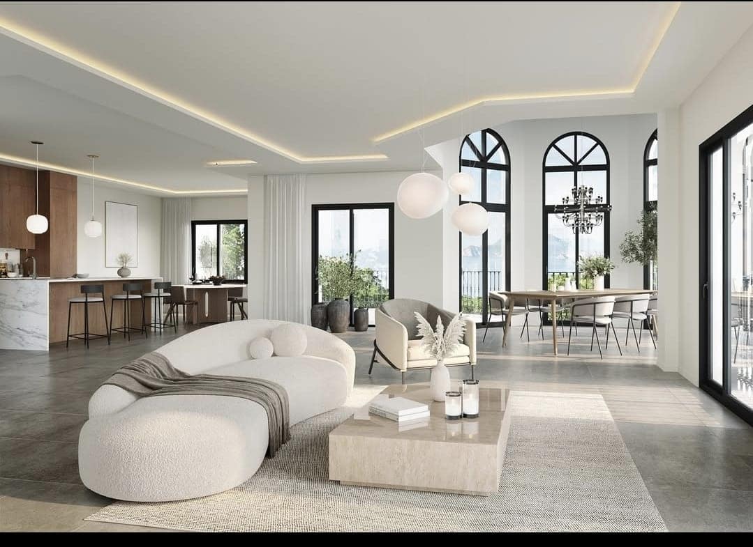 This 157-square-meter floor is designes for elegant everyday living. The open-plan layout connects the living room and kitchen, framed by floor-to-ceiling windows that fill the space with natural light. High ceilings further enhance the sense of openness, while the tower section adds architectural distinction. The modern kitchen offers ample workspace, high-end appliances, and generous storage.