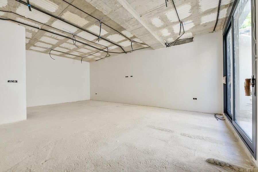 The next floor of 190 m2 of enclosed space is located below the plot level but 3 metres above the street level and therefore with natural light. It can be accessed by lift or staircase inside the villa, or by the staircase outside the garage, in the latter case you can only access the exterior corridors, the installations room or the main door of this floor, thus making the maintenance of the house without the need to enter inside the house. Inside this floor we will find 4 spacious bedrooms, living room with English patio of 17 m2 with the stairs to the plot, laundry, 2 bathrooms, exterior corridors of 40 m2 and installations room.
