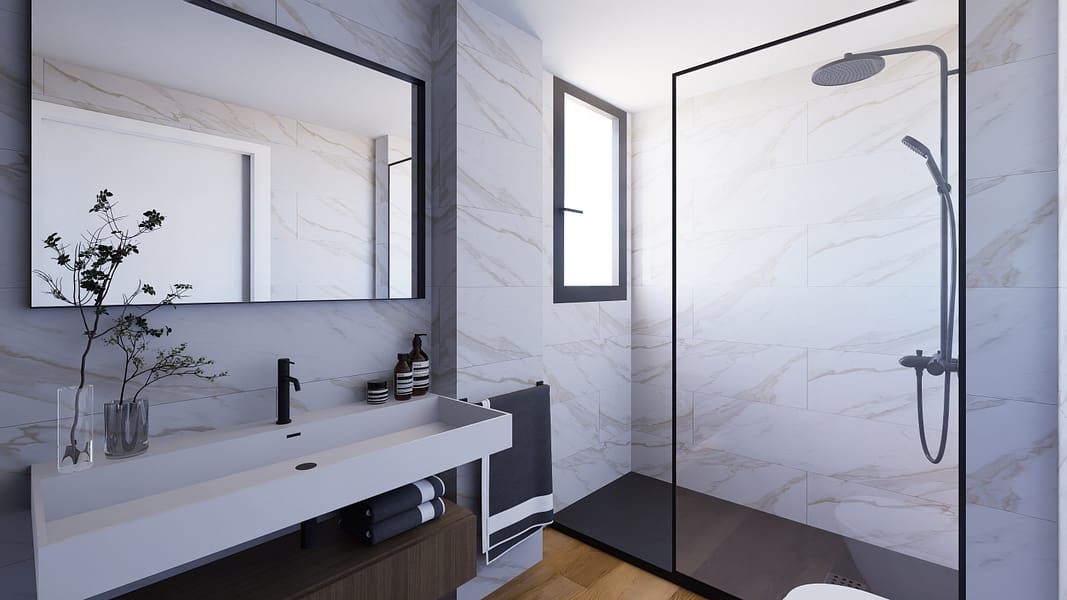 The bathrooms are designed with top-quality materials from the renowned Porcelanosa Group, offering a perfect balance of luxury and practicality: