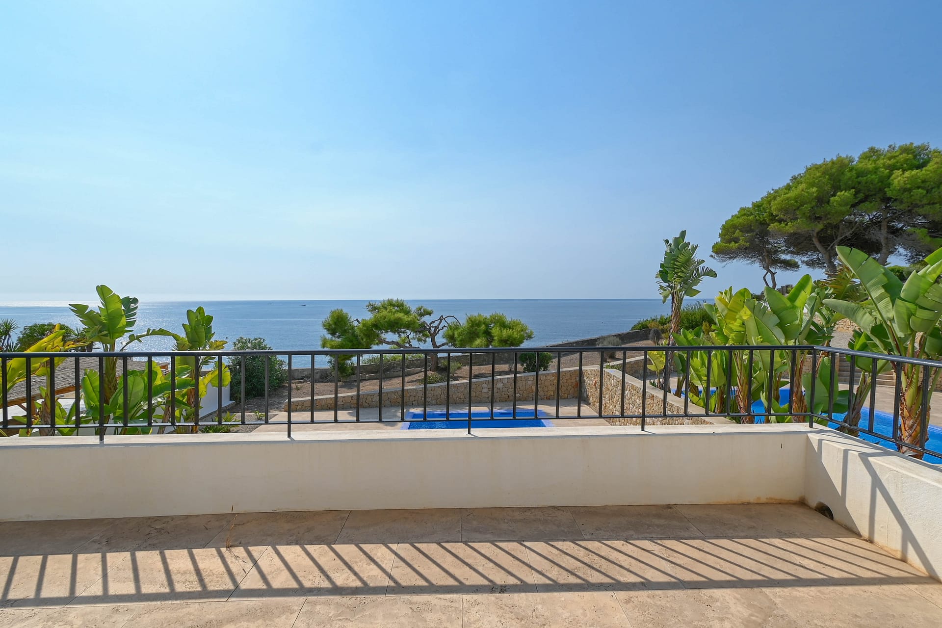 Accessed via internal stairs or the lift, the first floor comprises three additional bedrooms and three en-suite bathrooms. The large upper terrace access ensures that two rooms enjoy sweeping panoramic vistas of the Mediterranean, whilst the other enjoys full frontal sea views from a balcony, all three creating serene retreats for residents and guests alike.