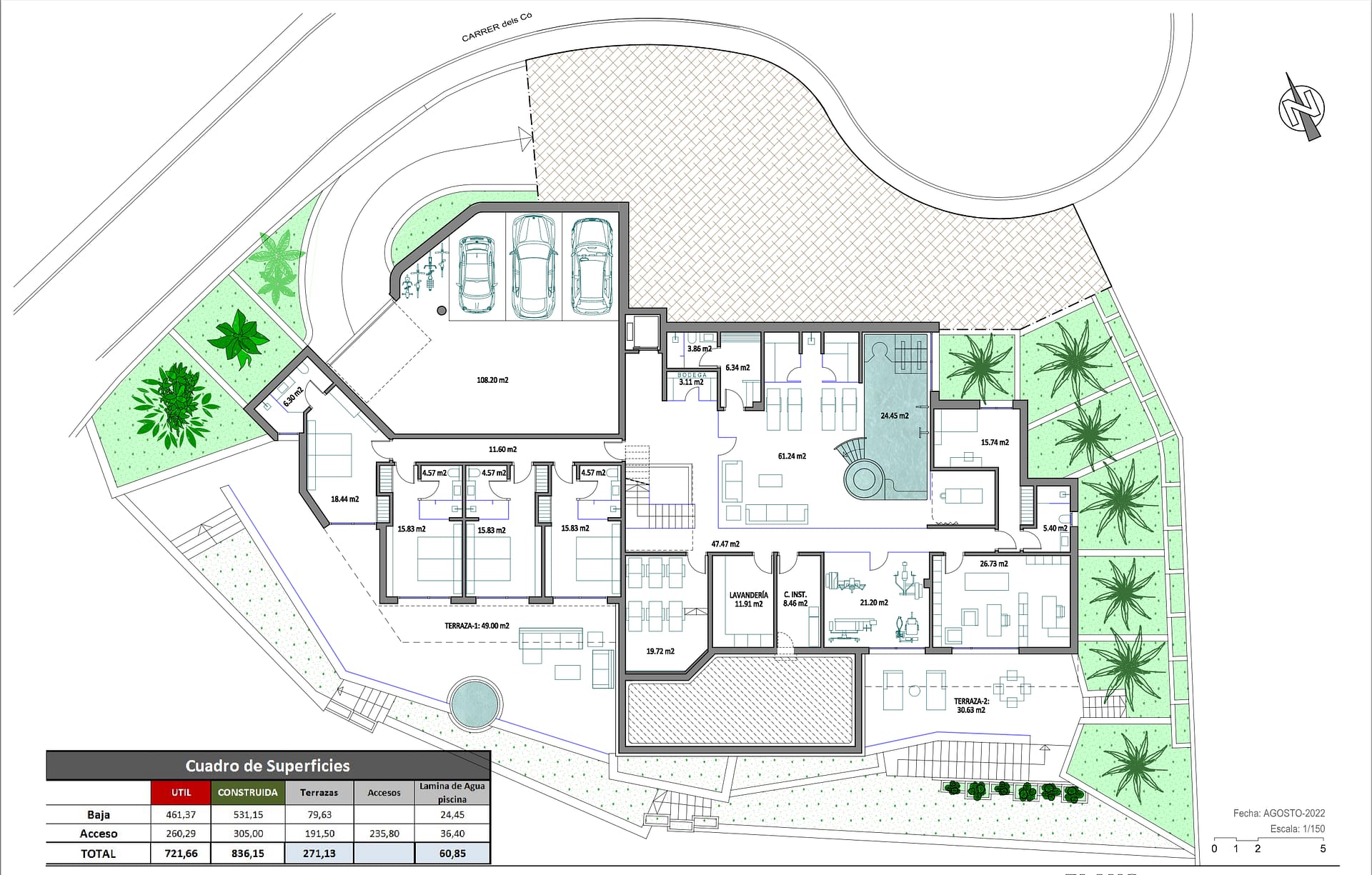 The ground floor is dedicated to leisure and luxury. The north wing hosts a large wine cellar, a gym, a laundry room, and a private cinema, providing entertainment and relaxation at every turn. An indoor oasis awaits, featuring a 24.45 m² pool, spa, sauna, and two additional lavish bathrooms.