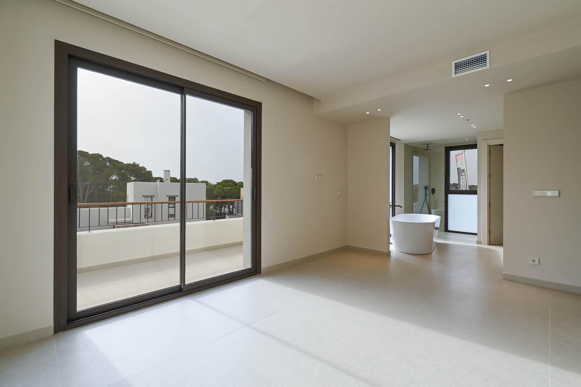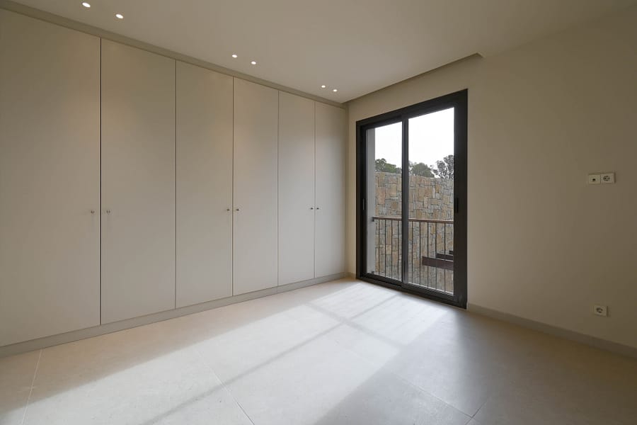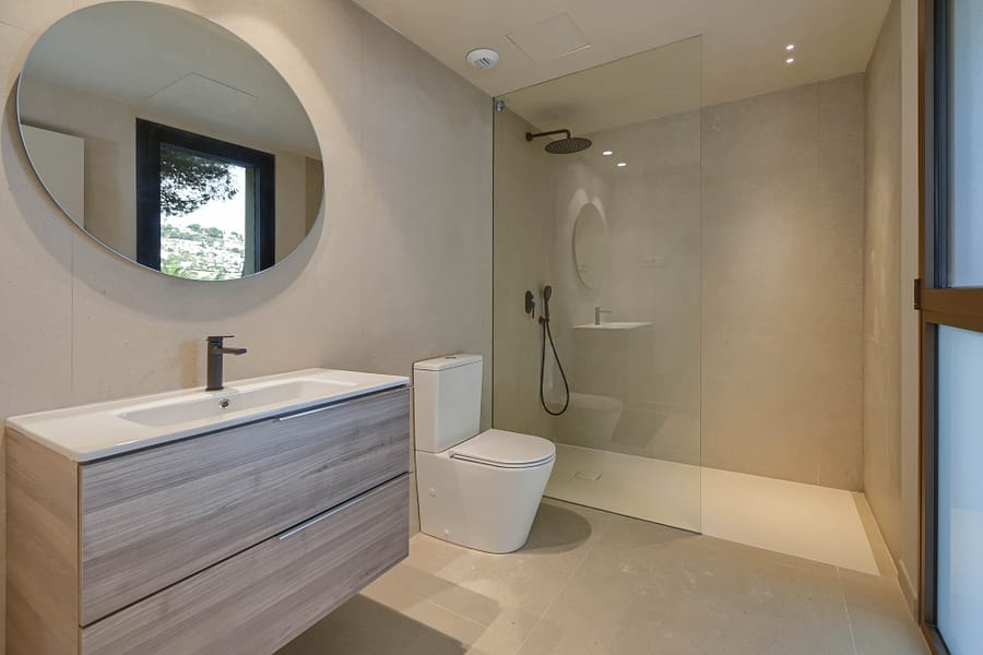 The upper level is dedicated to a fabulous master suite with a spa-inspired bathroom and walk-in wardrobe, The upper floor is complemented by an additional en-suite bedroom. Both open onto a private solarium with open views toward the Mediterranean and Moraira town.
