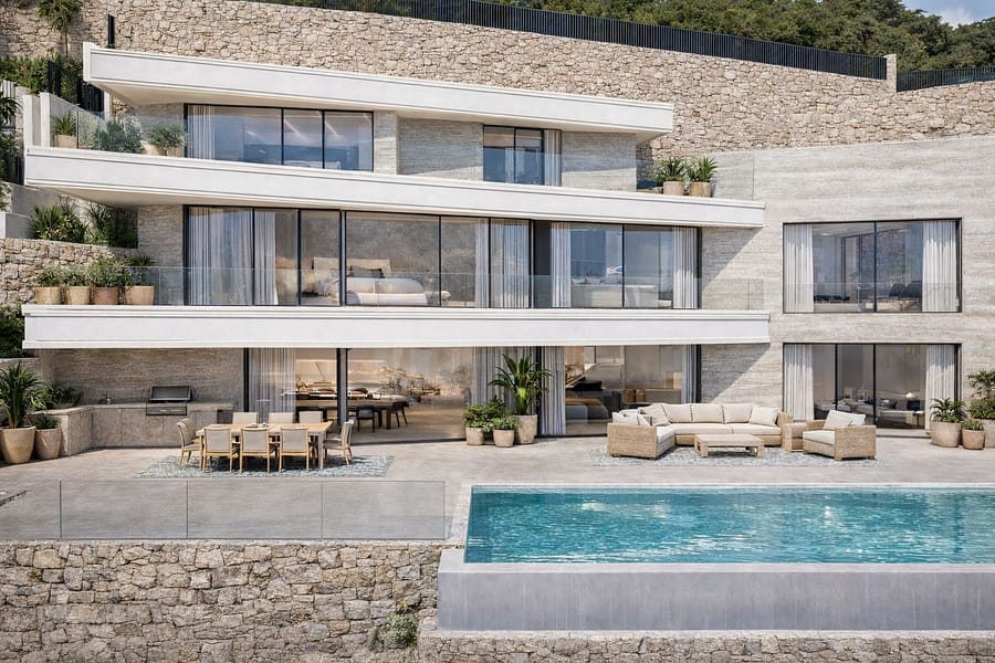 A series of generous terraces extend the living environment outdoors, creating the ideal setting for long Mediterranean afternoons, sunset entertaining and uninterrupted sea-view living. The villa’s positioning within Racó de Galeno ensures a sense of peace and prestige. While the architecture maintains a strong connection to the landscape.
